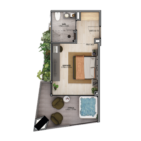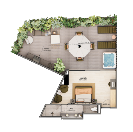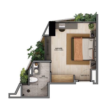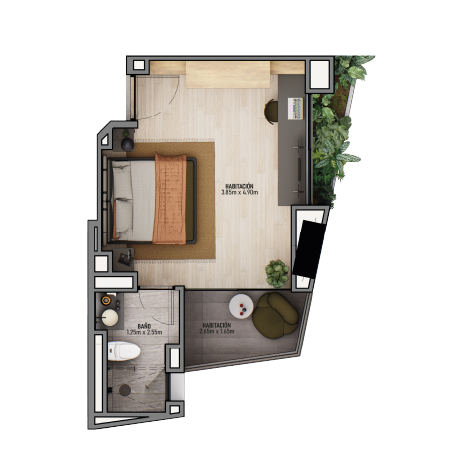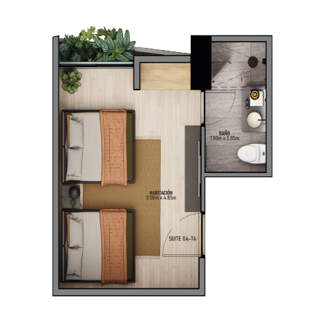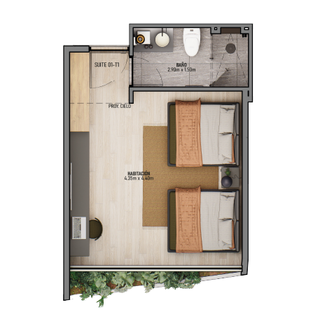 Distribución: Habitación · Baño